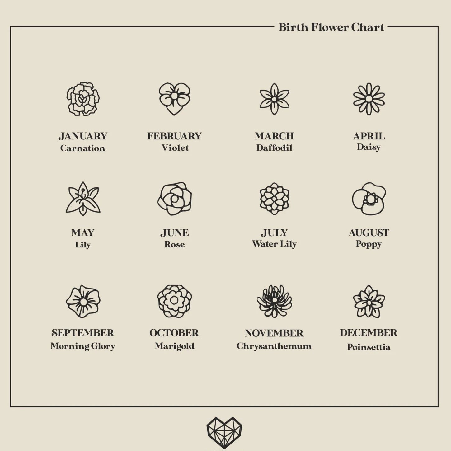 Our birth flower pieces may come in a variety of styles and formats—but the meaning behind each stone stays the same. Below is a quick reference to the traditional birth flowers associated with each month.